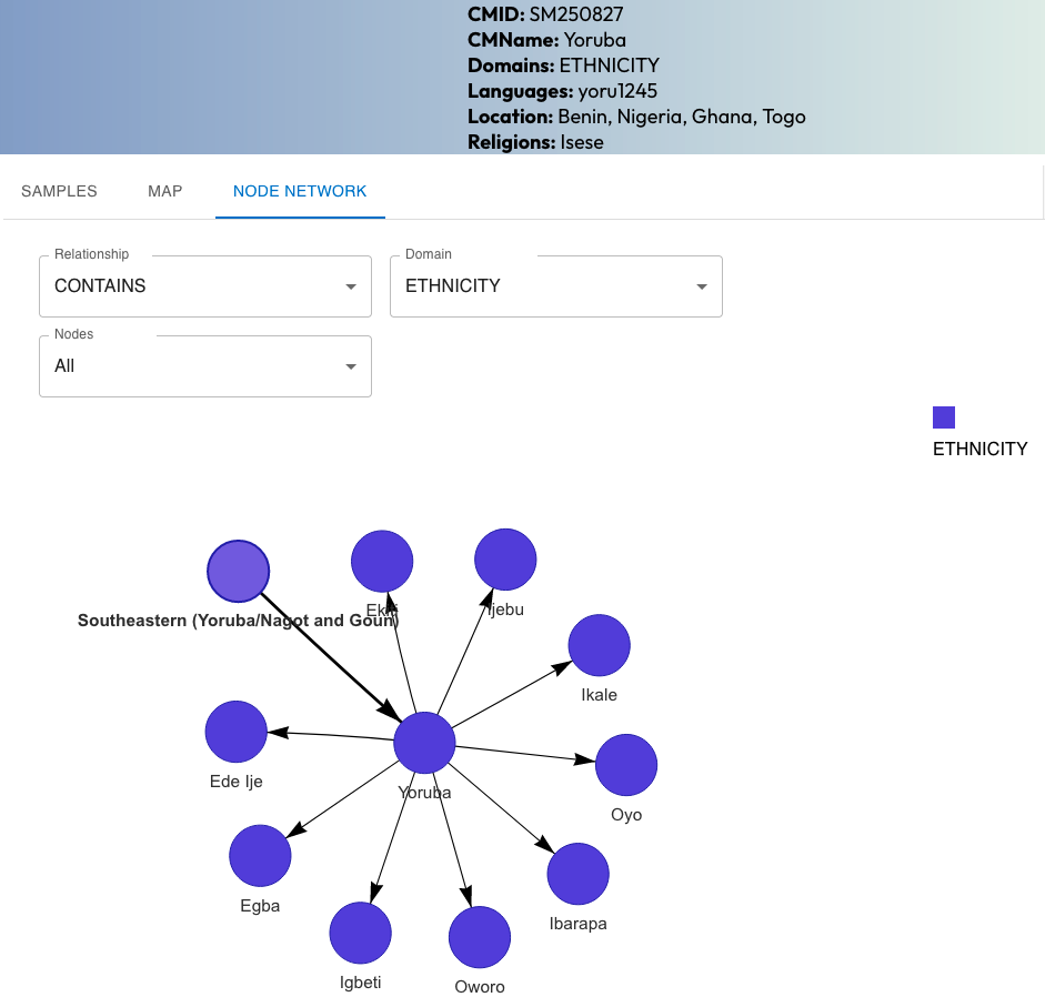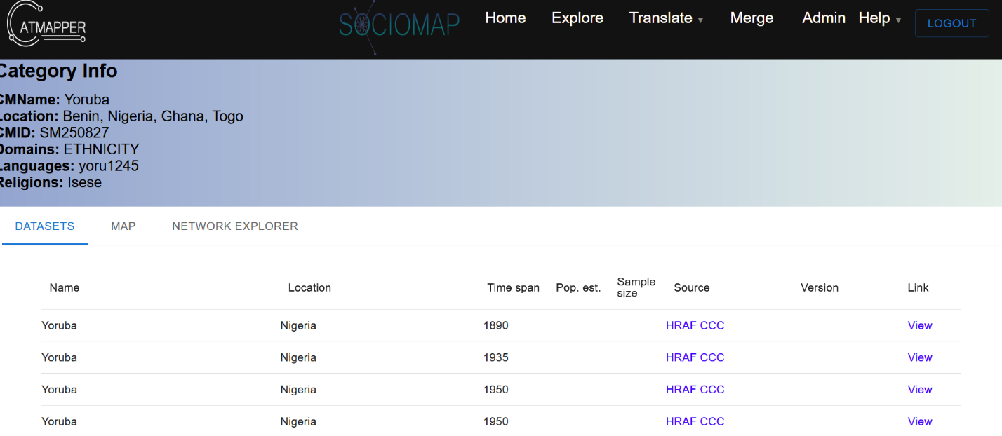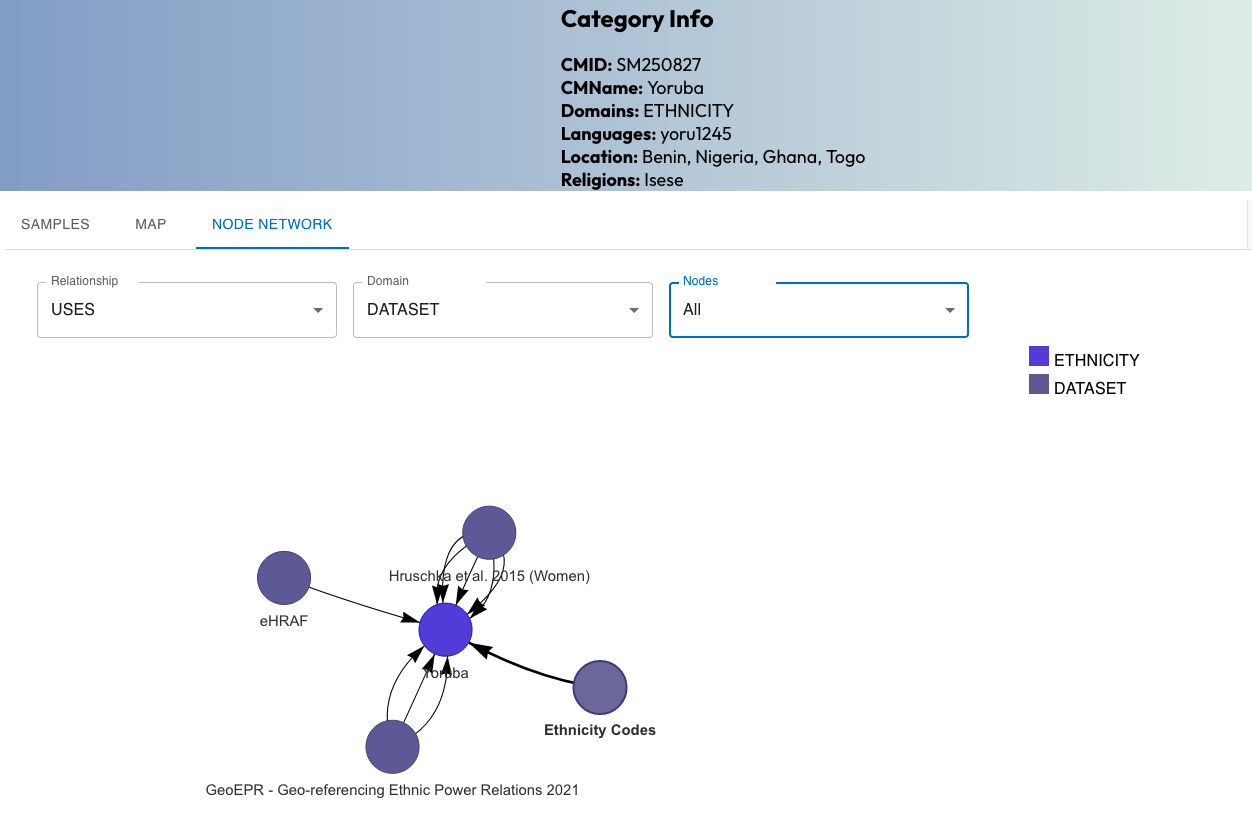 Under the header Category Info, information about the ethnicity is summarized. Below, the ‘Samples’ table gives additional information about the datasets that contain information about the category. The ‘Maps’ tab shows geographic information about the category. The ‘Network Explorer’ tab displays information about the relationships that the category has with other categories within SocioMap.