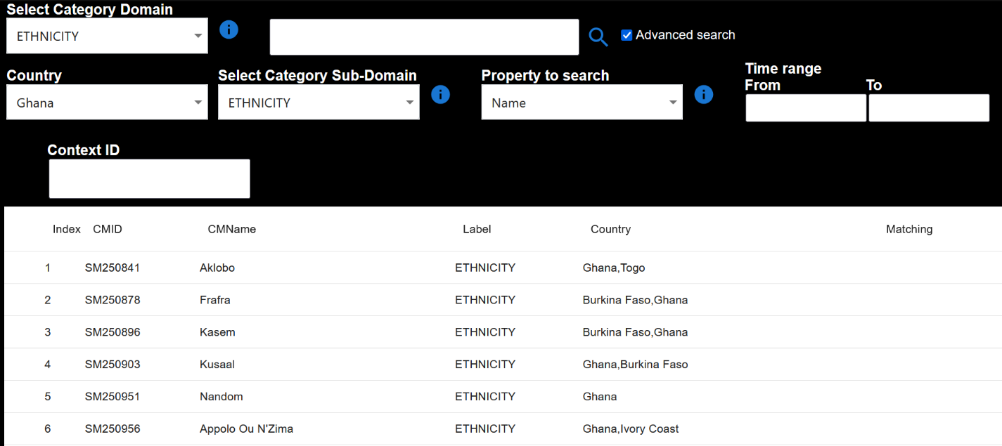 In this case, we are looking for all the ethnicities associated with Ghana. You can see that there are a total of 166 associated ethnicities stored within SocioMap. Clicking the row will allow you get contextual information about that Ethnicity.