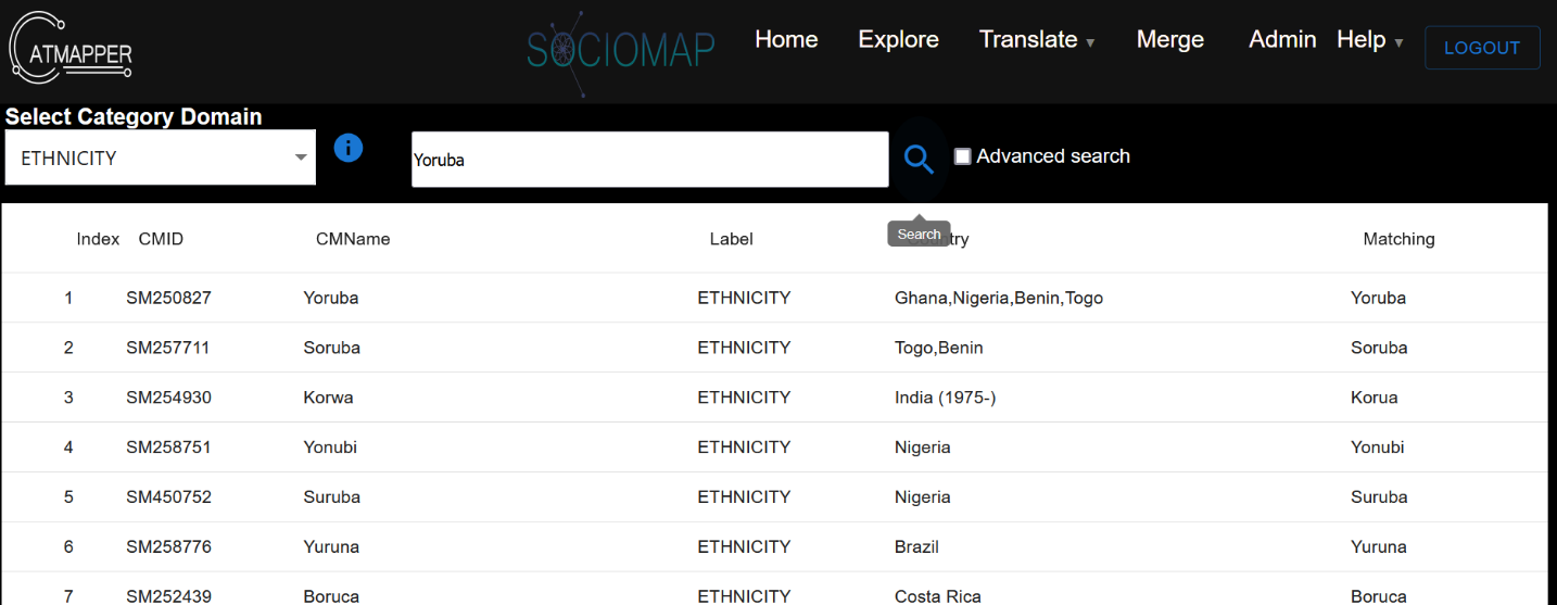 In this example, we want to know about the ethnic group Yoruba. We go through the process of getting the contextual information, finding the datasets that include information about Yoruba, how certain datasets encode the ethnic category of Yoruba, and find other information about Yoruba within SocioMap.